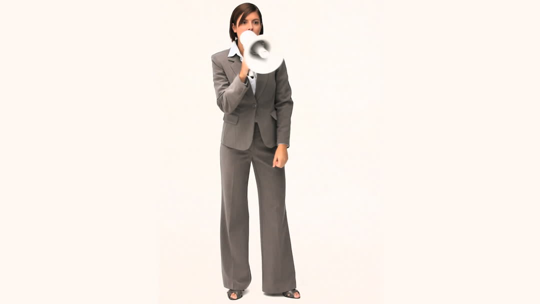 This video features a businesswoman standing confidently in a formal suit while using a megaphone to amplify her message. Ideal for content related to leadership, business communication, persuasion in marketing, motivational speaking concepts, or team announcements. Useful in articles, blog posts, and presentations highlighting effective communication and confident leadership within professional environments.