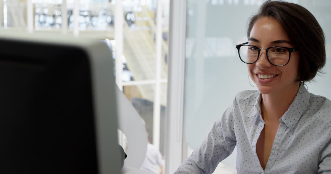 Young Caucasian businesswoman wearing eyeglasses engaging with work on her computer in a modern office environment. Her smile and demeanor display confidence and professionalism, making this ideal for business articles, company websites, or promotional material featuring workplace culture and efficiency.