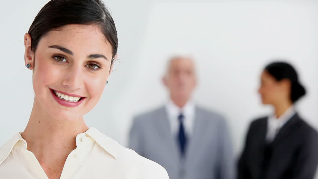This video shows a smiling businesswoman prominently in the foreground, with two colleagues conversing in the background. The clean and minimalistic office setting emphasizes professionalism and teamwork. This video is perfect for illustrating concepts like successful business dynamics, leadership qualities, collaborative environment, or company culture. It is also suitable for use in brochures, websites, or articles related to business and corporate settings.