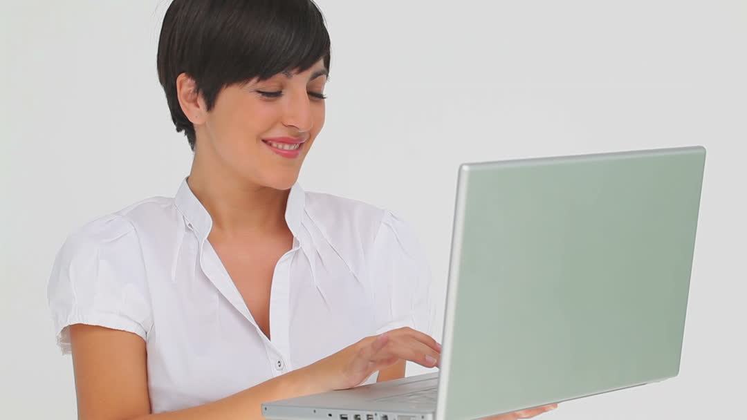A woman in a white shirt is seen confidently typing on a laptop, exemplifying professionalism and efficiency. Her smiling expression adds a friendly, approachable tone. Perfect for portraying modern workplace themes, online business concepts, or illustrating corporate training materials.