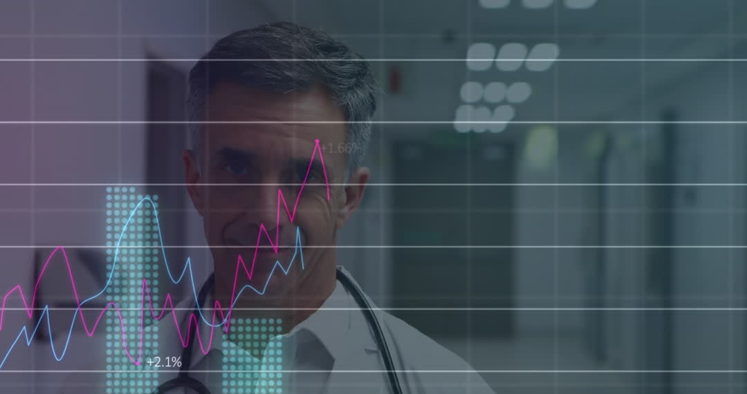 Caucasian male doctor with medical data overlay, exploring advancements in healthcare services and trends. Suitable for healthcare industry publications, data-driven medical solutions, or illustrating statistical analysis in medical fields.