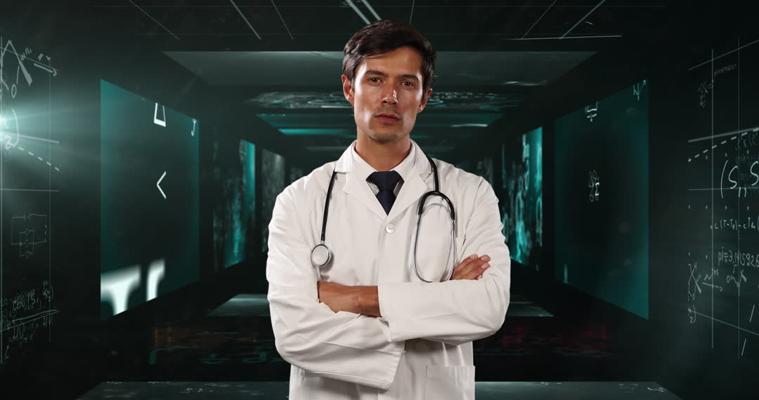 Caucasian male doctor standing confidently in futuristic environment. Animation of mathematical equations surrounding concept of advancing medical technology and innovation. Ideal for use in healthcare industry content or medical research promotions.