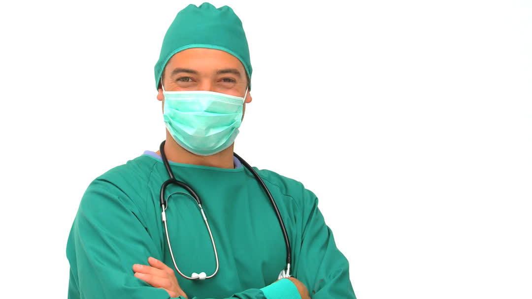 A confident male doctor in green surgical attire is standing with arms crossed, viewed against a plain white backdrop. Featuring a face mask and stethoscope, this video signifies trust and professional competence in a healthcare setting. Perfect for use in medical advertisements, health websites, or hospital publications.