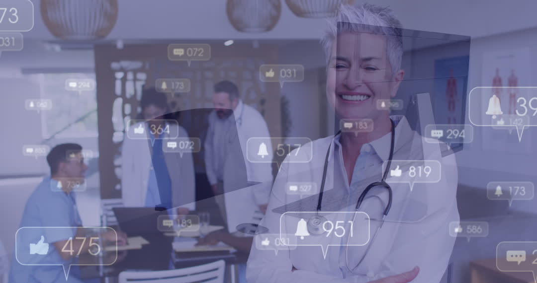 An innovative representation of healthcare's intersection with social media technology. The video shows a smiling, confident doctor amidst digital notifications. This can be used to depict themes of telemedicine, healthcare advancements, the impact of social media in the medical field, or digital healthcare marketing.