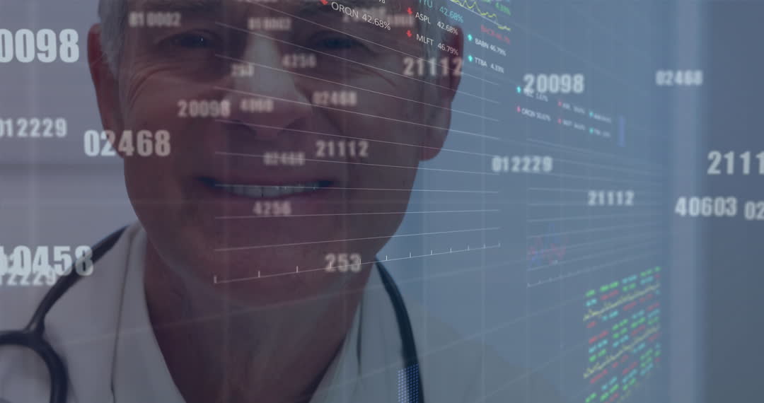 Image depicts a confident smiling doctor with superimposed financial data graphs, representing the intersection of healthcare services and financial business technology. Suitable for illustrating articles or campaigns about medical industry trends, healthcare management, or technology advancements in medicine.