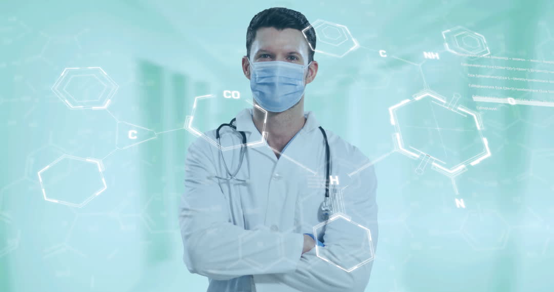 A skilled medical professional stands confidently with arms crossed, wearing a surgical mask and stethoscope. Intricate holographic data visuals float in the foreground, symbolizing modern healthcare and medical technology advancements. Ideal for illustrating scientific research, healthcare technology, or medical presentations.