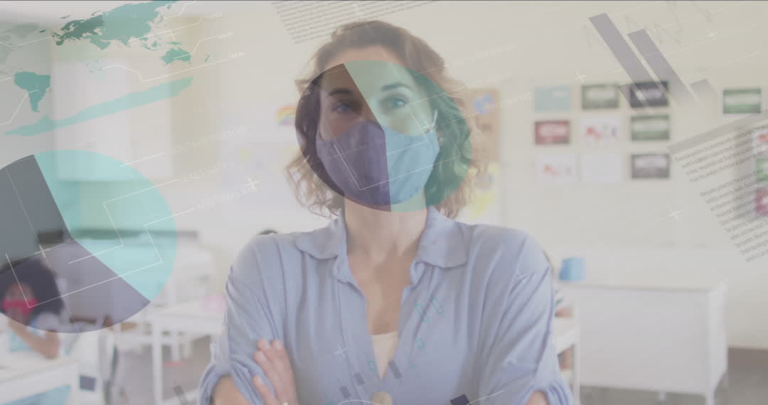 A woman stands confidently in a classroom environment, wearing a face mask with statistical data overlays in the foreground. This video represents the integration of technology and education during the pandemic. Perfect for use in articles about virtual learning, data analysis in education, or pandemic impacts on teaching practices.
