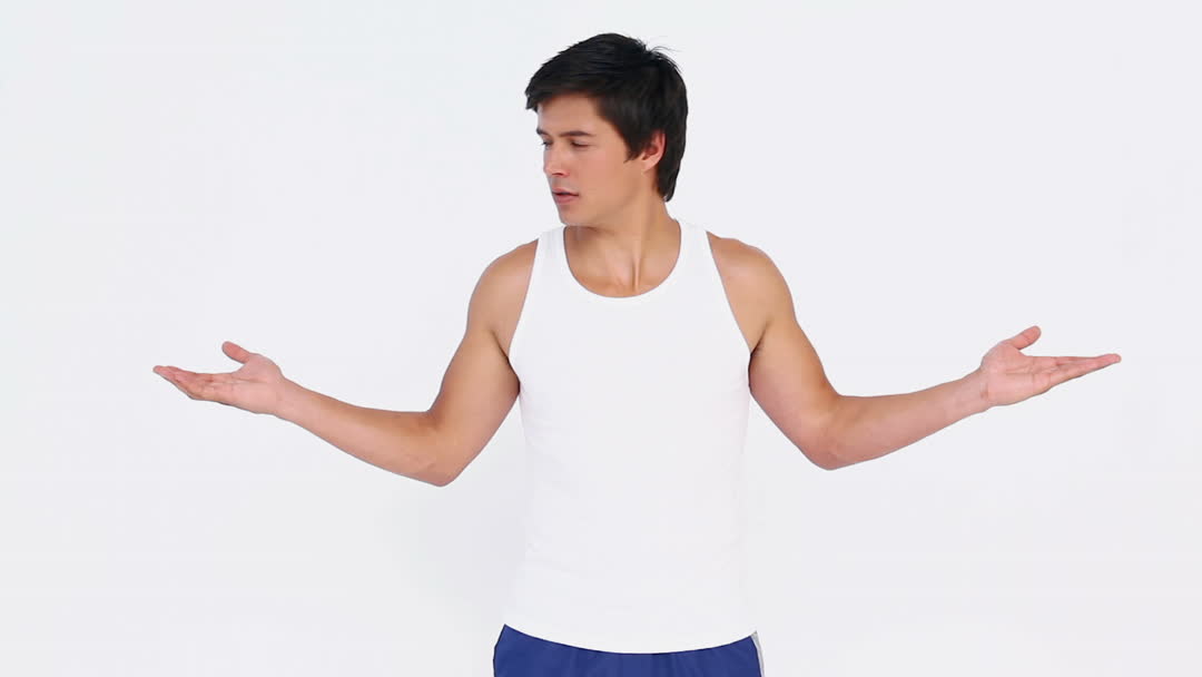 A casual man wearing a white tank top and blue shorts is standing and gesturing confidently with open arms against a plain white background. This video can be used for concepts of confidence, presenting ideas, making decisions, or appealing to openness and communication. Suitable for advertisements, lifestyle articles, or fashion content.