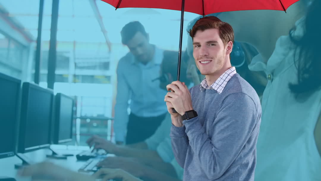 Man holding a red umbrella while standing confidently indoors, with colleagues in background working at computers. Useful for advertisements on teamwork under unexpected circumstances or business presentations needing visual metaphors.