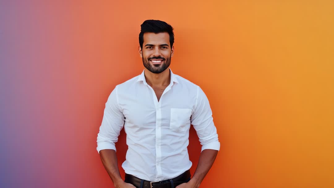 AI Generated Image. Featuring man standing against smooth orange-purple gradient wall, smiling and posing with relaxed, confident posture. Capturing tight midshot with direct eye contact and natural expression. Wardrobe crisp white button-down shirt with sleeves rolled, casual business look. Lighting soft and even, skin tones warm, background minimal and colorful. Working well for corporate profile videos, personal branding reels, social media ads, website hero banners, dating profiles, casting reels, influencer content, lifestyle blogs, marketing and advertising campaigns. Use for thumbnail images, header video loops, promo clips, onboarding screens, presentation slides, recruitment pages, fashion lookbooks. Recommend pairing with bold sans-serif text overlay and warm color palette for cohesive brand messaging. Suitable for stock libraries, commercial licensing, editorial use, advertising assets.