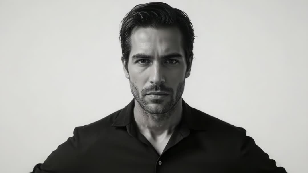 AI Generated Image. Man confidently standing with hands on hips in a minimalist studio background conveys confidence and professionalism. Wearing a black shirt, he embodies strength and determination. Ideal for promotions related to leadership, business confidence, or personal coaching. Use in articles about masculinity, self-assurance, or lifestyle.