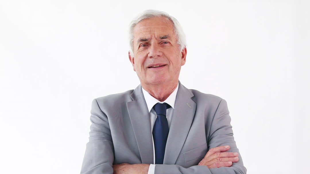 Mature businessman smiling with confidence, conveying professionalism and leadership. Arms crossed demonstrates confidence and self-assuredness ideal for corporate materials, business presentations, and professional development resources. Useful for illustrating executive branding or showcasing a trustworthy professional figure in business contexts.