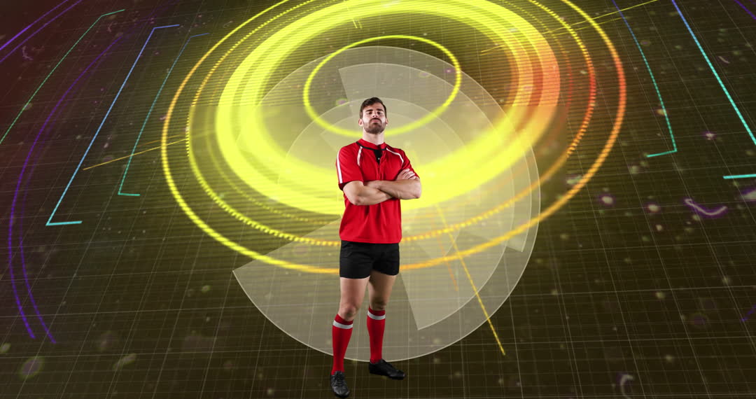 Confident Rugby Player Amidst Futuristic Data Visualization Video