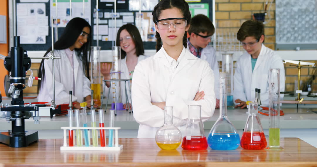 Young female student confidently standing with crossed arms in a chemistry lab, surrounded by classmates engaged in scientific experiments. Test tubes and flasks with colorful liquids on the table. All students wearing white lab coats and safety goggles. Great for illustrating educational content, teamwork in science, or promoting STEM education in schools.