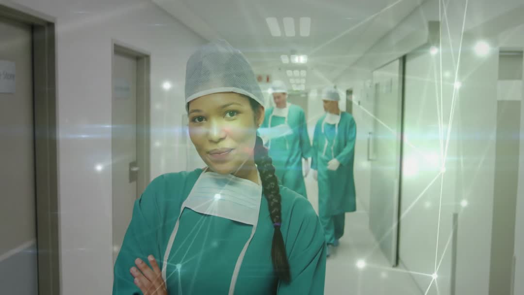 A confident surgeon standing in a hospital corridor with digital network overlays, symbolizing medical innovation and technology integration in healthcare. Ideal for use in articles or presentations about modern medical practices, teamwork in healthcare environments, or technological advancements in surgery.