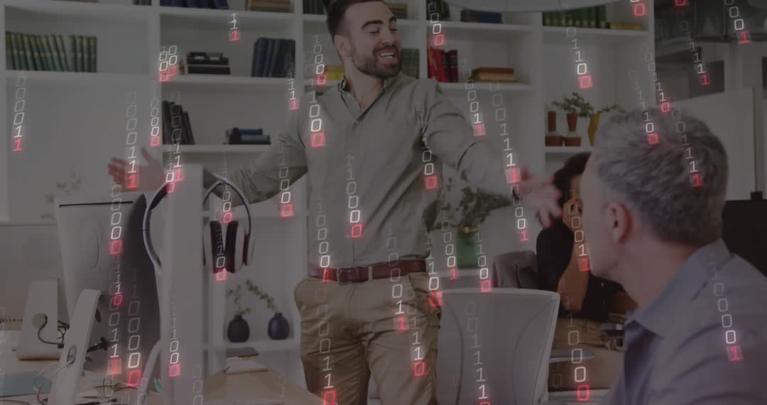 Professional dressed in an office setting interactively engaging with colleagues in a collaborative environment. Facing each other in modern workspace featuring computers, adding to progressive atmosphere enhanced by digital binary code effect signifying tech integration. Suitable for illustrating teamwork, tech advancements, effective communication, software development scenarios, workplaces focusing on innovation within a technology-driven industry.