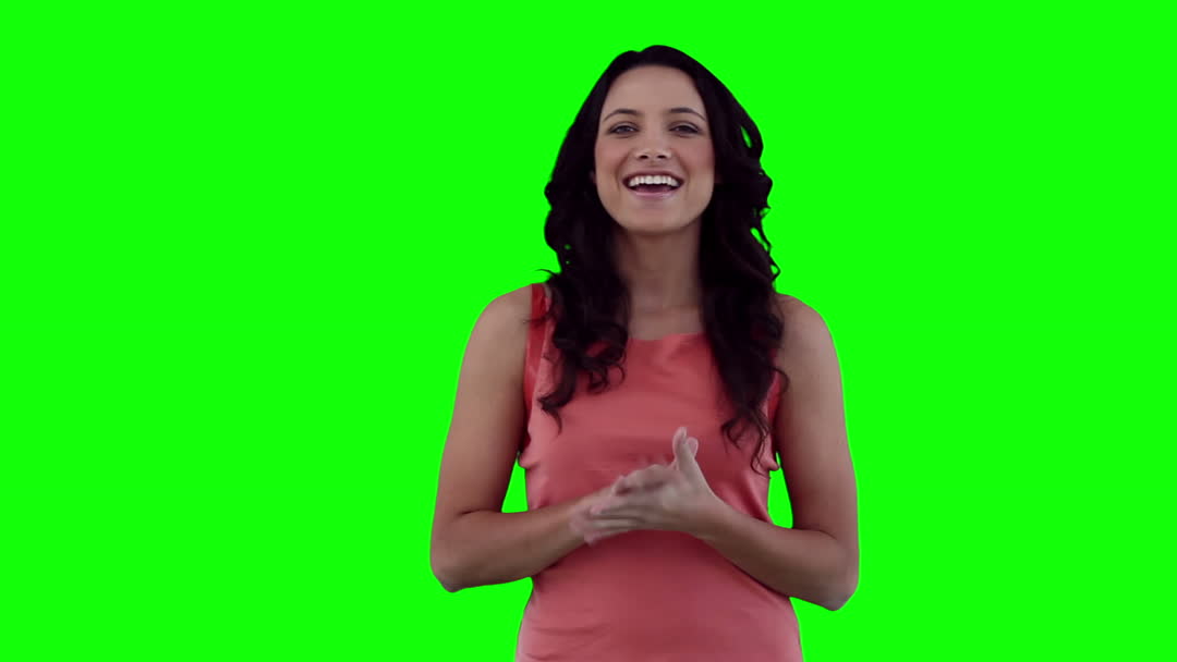 Woman standing in front of a vibrant green screen, smiling warmly as she gives a presentation. Could be used for video production, corporate training materials, or any content requiring a customizable background. The bright green screen allows for easy replacement with digital visuals.
