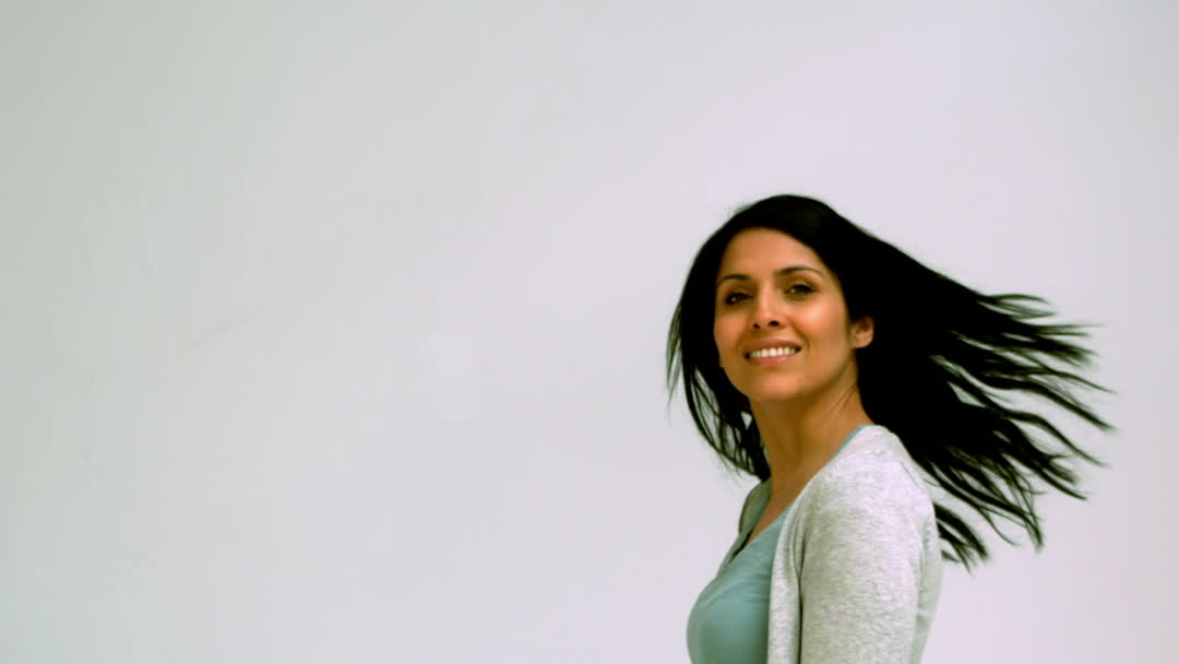 Shows a confident woman with long dark hair elegantly shaking her head. Ideal for beauty or hair care marketing materials, or lifestyle campaigns promoting positivity and freedom.