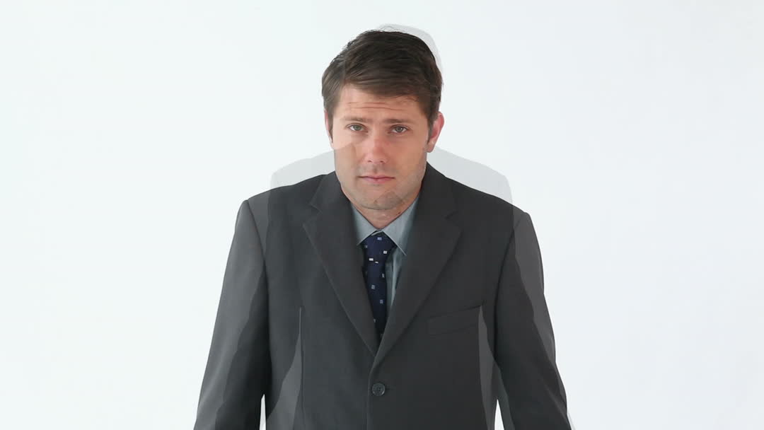 The video shows a middle-aged man in a formal business suit shrugging his shoulders, presenting an expression of confusion or uncertainty. This composition is against a stark white background. It is useful in illustrating themes of indecision or confusion, often utilized in business articles, presentations addressing uncertainty, promotional material related to consulting services, or editorial pieces on human behavior.