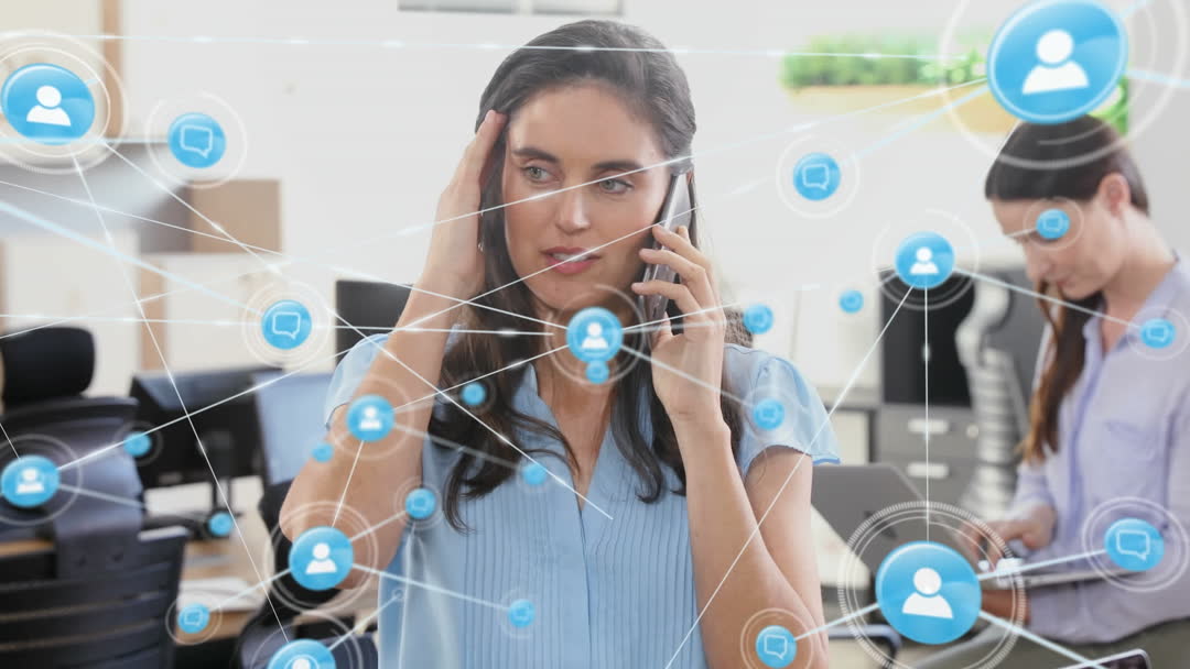 Visual depicts a confused woman in a professional setting, communicating via smartphone, overlayed with digital icons representing network connections. Illustrates challenges of navigating digital communications within a business context. Useful for topics on digital connectivity, business communication issues, or technology's impact on the workplace.