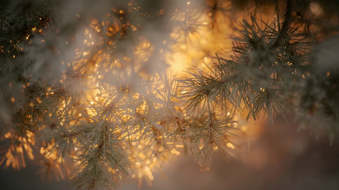 - Conifer needles shimmering in golden-hour backlight with floating bokeh pollen cinematic clip