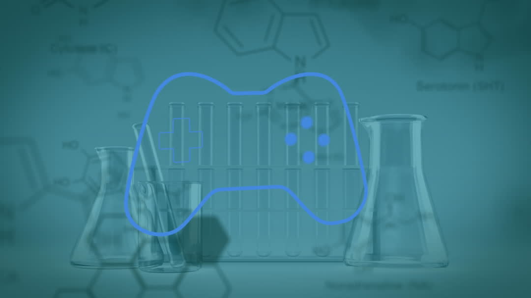 This visual illustrates the merger of science and technology concepts, highlighting the potential of using gaming simulations for educational and healthcare advancements. The animation features a game controller overlaid on laboratory equipment, symbolizing how interactive technology is used to engage in scientific research. Useful for presentations on tech advancements in healthcare, e-learning in chemistry and genetics, and innovations in digital gaming used in educational contexts.