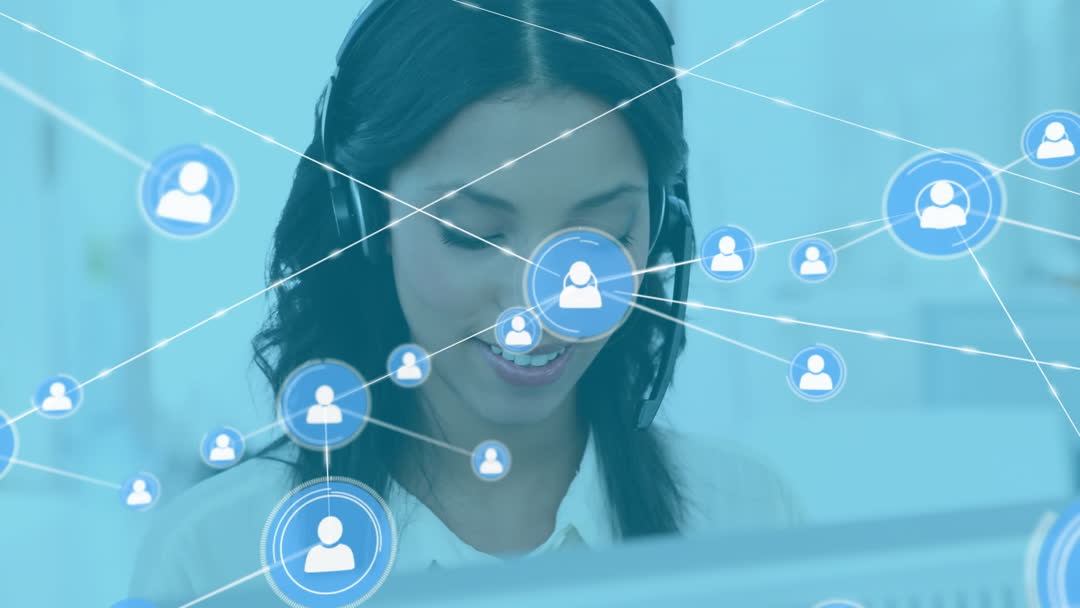 Showcasing a biracial businesswoman using a phone headset surrounded by digital networking icons. Represents the concepts of communication, global connectivity, and customer service in a technological setting. Ideal for illustrating articles on virtual meetings, international business, or customer relationship management technology.