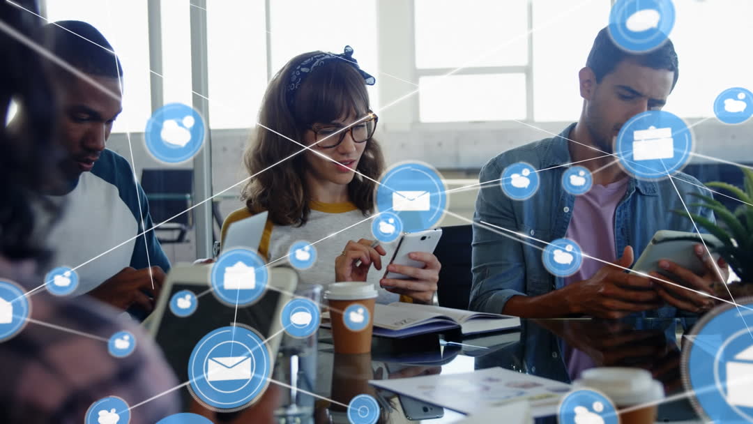Diverse group of professionals in a modern office setting uses smartphones and tablets, enhanced by digital network icons, illustrating global communication and connectivity. Ideal for showcasing teamwork, tech-driven collaboration in business environments, and digital networking in stock photography and presentations.