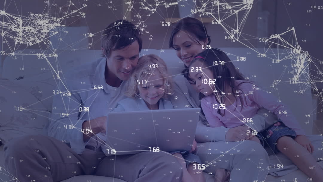 Family gathered around laptop representing connectivity and engagement with technology. Numbers and connections overlay suggest digital interactions and data analysis. Useful for topics on digital education, technology integration, or family tech engagement. Ideal for advertising home tech products, educational applications, and internet services.