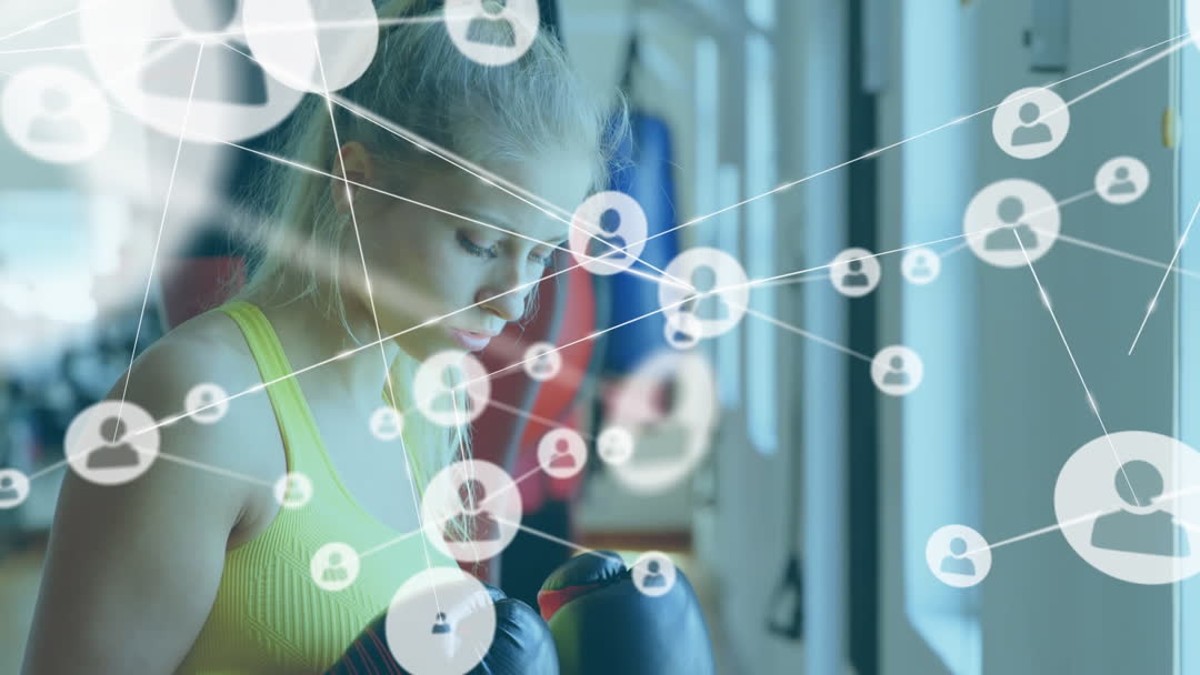Woman wearing boxing gloves trains in gym with abstract digital icons representing connectivity and modern technology overlay. Highlighting fitness and communication integration, ideal for illustrating active lifestyle, sports technology, and social media influence in personal training or tech-forward health presentations and advertisements.