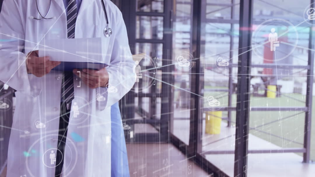 A doctor in white coat reviewing data on a clipboard, overlaid with digital network icons, representing the integration of technology in healthcare. Suitable for illustrating topics on healthcare innovation, digital health systems, and modern medical practices.