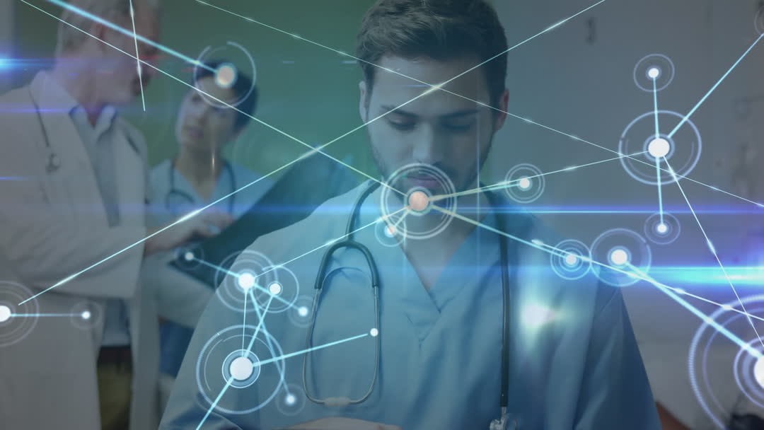 The video visualizes a concept of modern healthcare systems using advanced telecommunications that integrates digital and physical healthcare. The presence of linked dots represents data and connectivity, emphasizing the role of technology in improving medical quality. This visual is ideal for illustrating articles on medical innovations, healthcare professionalism, technological advancements in medicine, and the role of ICT in modern healthcare settings.