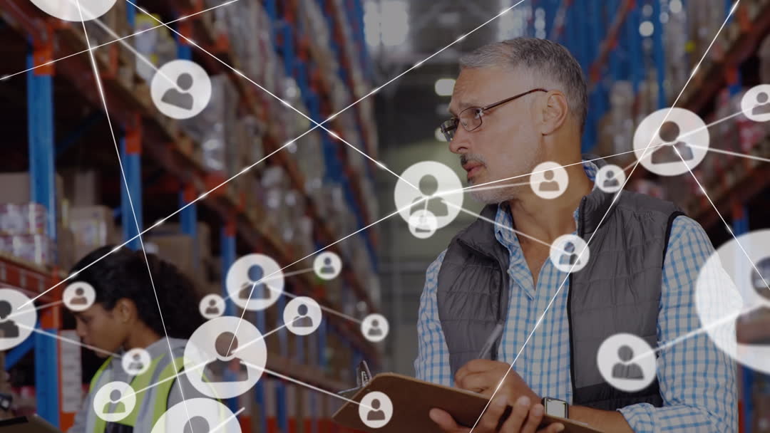 This visual depicts the integration of digital technology in a warehouse setting, highlighting connections between staff as symbolized by overlay networks and person icons. The Caucasian man recording data on a clipboard brings focus to the merging of traditional manual tasks with modern connectivity solutions. Suitable for illustrating concepts of modern logistics, supply chain innovations, and digital transformation in business environments.
