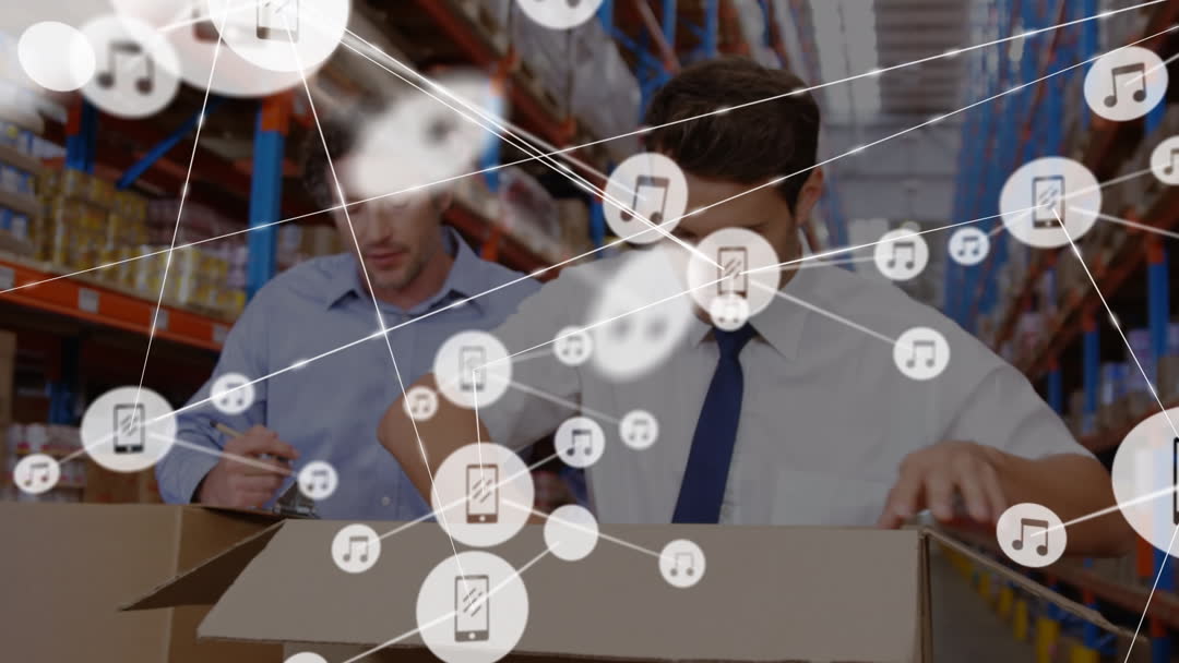 Scene captures workers in a warehouse leveraged by high-tech network systems symbolized by graphic icons. Indicates modern advancements and global connectivity within shipping and logistics industries. Ideal for illustrating concepts of digital transformation, inventory management, or distribution in business and trade sectors.