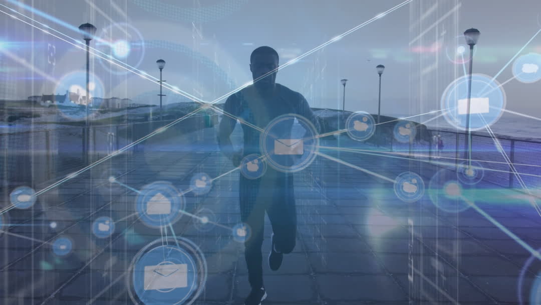 A man jogging on a pier by the sea is overlaid with digital email icons connecting nodes, symbolizing interconnectedness and technology infusion in fitness activities. This composition highlights the concept of integrating digital communication and personal health. Suitable for use in articles, advertisements, or projects related to fitness technology, connectivity, and modern lifestyle choices.