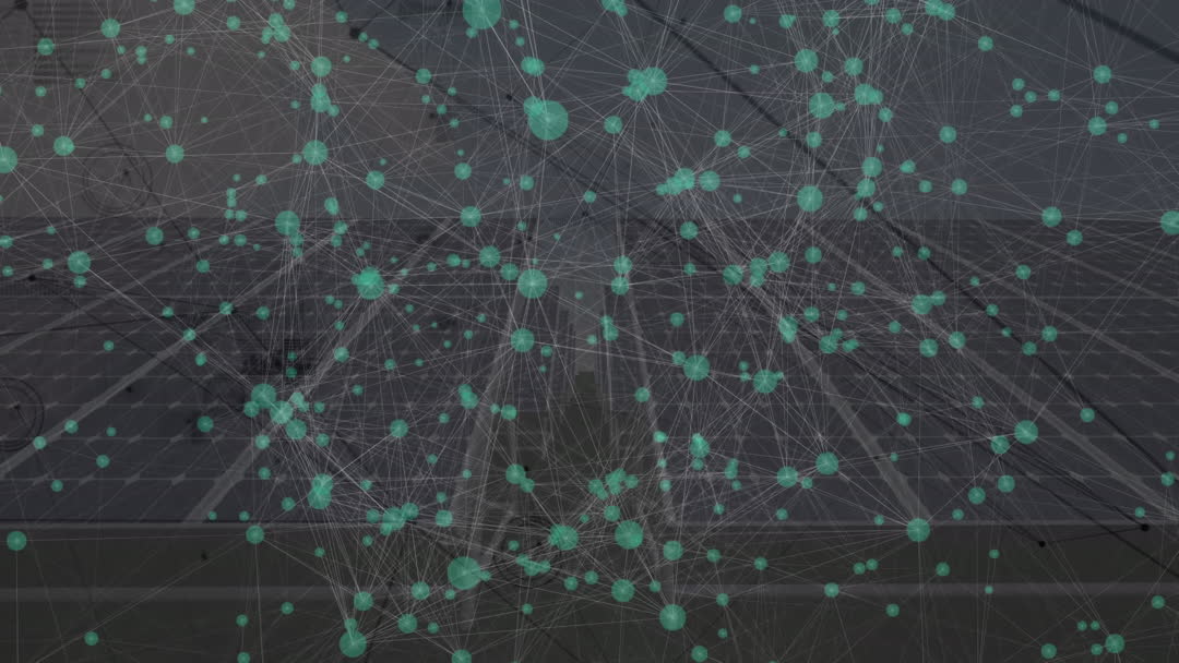 Animation shows a complex network of connections overlaying rows of solar panels, representing the merger of digital and renewable sectors. Useful for illustrating advancements in renewable technology, integration of data processing in energy management, or discussions around global energy systems and innovation.