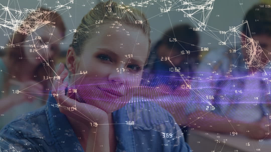 Diverse group of students engaging in a classroom with visual network overlays symbolizing global connections and digital communication in modern education. Ideal for illustrating concepts of international studies, online learning platforms, global connectivity, and innovative educational technologies. Suitable for use in articles, marketing for educational software, and presentations on modern education systems.