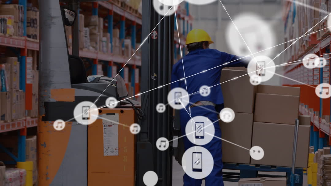 A warehouse worker in yellow hard hat managing boxes surrounded by digitally imposed network icons signals innovation. Ideal for topics on logistics, digital transformation in industries, supply chain advancements, global shipping, and technological integrations in business operations.