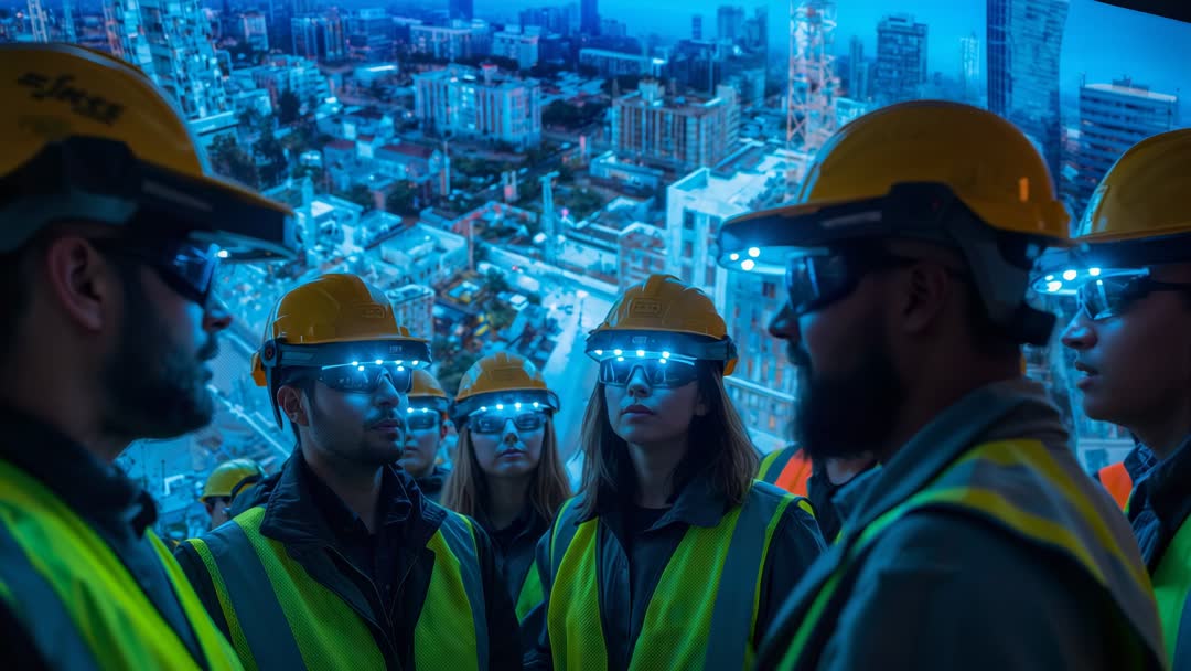 - Construction crew activating AR headsets while briefing over digital city model at night
