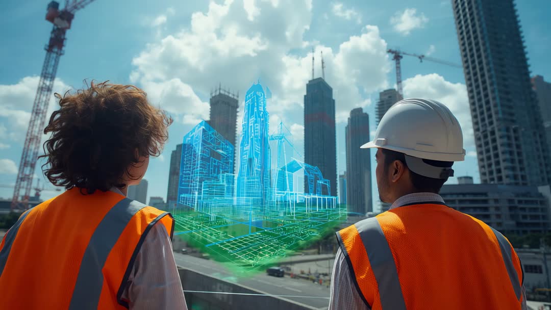 AI Generated Image. Featuring two construction professionals reviewing holographic 3D city model over active urban building site with cranes and skyline in background. Showing planner pointing at floating digital model while manager wearing hard hat and hi vis vest nodding. Emphasizing collaboration, project planning, BIM integration, and AR visualization for modern construction workflows. Ideal for using in architecture firm presentations, urban planning proposals, construction technology demos, smart city marketing, and project management training. Supporting editorial pieces about digital twin, infrastructure investment, and sustainable urban design. Working well as hero clip for corporate websites, pitch decks, social media ads, video backgrounds, and trade show reels. Suggesting pairing with subtle motion graphics, data overlays, and techno soundtrack to highlight innovation and future-focused branding.