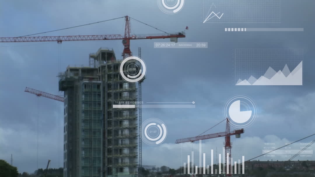 This digital composite showcases the energetic development of a skyscraper under a cloudy sky, with dynamic graphs overlaying the scene. Suitable for presentations on modern construction methods, urban development, and technology-enhanced project management. Engaging use in construction company marketing material, tech symposiums, and industry keynotes.