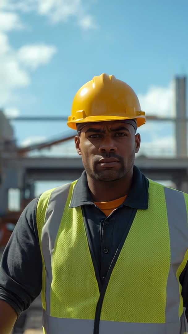 AI Generated Video. Showing close-up vertical footage of construction worker adjusting gloves while wearing hardhat and high-visibility vest on industrial site. Portrait framing focusing on face and upper body, shallow depth of field separating subject from background cranes and steel structures. Natural daylight creating crisp contrast and realistic colors, suitable for mobile-first distribution. Perfect for safety training videos, PPE promotion, construction recruitment campaigns, corporate social media posts, website hero banners, instructional manuals, on-site briefings. Edit-friendly clip for cutting into montage with other site operations or using as opener for industrial documentary. Color grading suggestions: emphasize warm skin tones and high-visibility vest, increase clarity on facial expression, slightly boost highlights on hardhat. Ideal aspect ratio for vertical platforms like Instagram Reels, TikTok, Snapchat; deliver short-form edits and 9:16 assets. Use lower third for name, role, company; include subtitles for accessibility and multilingual distribution. Licensing suitable for commercial advertising, editorial stories, internal training resources, and brand campaigns.