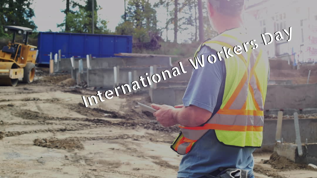 This depicts a construction worker on a building site, highlighting recognition of International Workers' Day. Use this for promoting labor rights campaigns, celebrating workers in construction, or illustrating trade-related content.