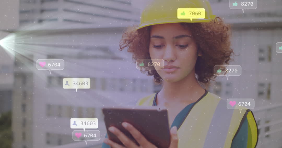 A construction worker wearing a safety helmet holds a tablet while multiple social media notifications overlay. This visual emphasizes the integration of technology and social media within industrial sectors. Ideal for use in articles or promotions about digital transformation in construction, the impact of technology on modern infrastructure workforces, and how connectivity enhances field communication and project management.
