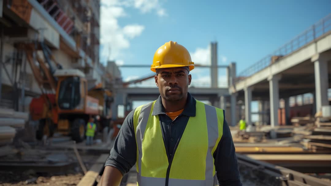 AI Generated Image. A construction worker wearing a hard hat and safety vest is walking amidst a busy construction site, visibly focusing on his task. The site showcases heavy machinery and partially built structures, highlighting industrial activity. Useful for themes of construction, safety practices, architecture and engineering industries, or portraying professionalism and resilience in labor-intensive environments.