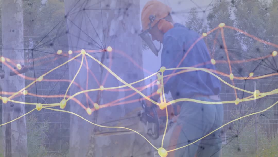 Image illustrates manual labor with a focus on safety in industrial construction also showcasing charts overlay for potential business themes. Ideal for articles on labor safety, construction techniques, and industrial work standards. Useful for employment advertisements or safety programs emphasizing chainsaw safety and accurate methods.