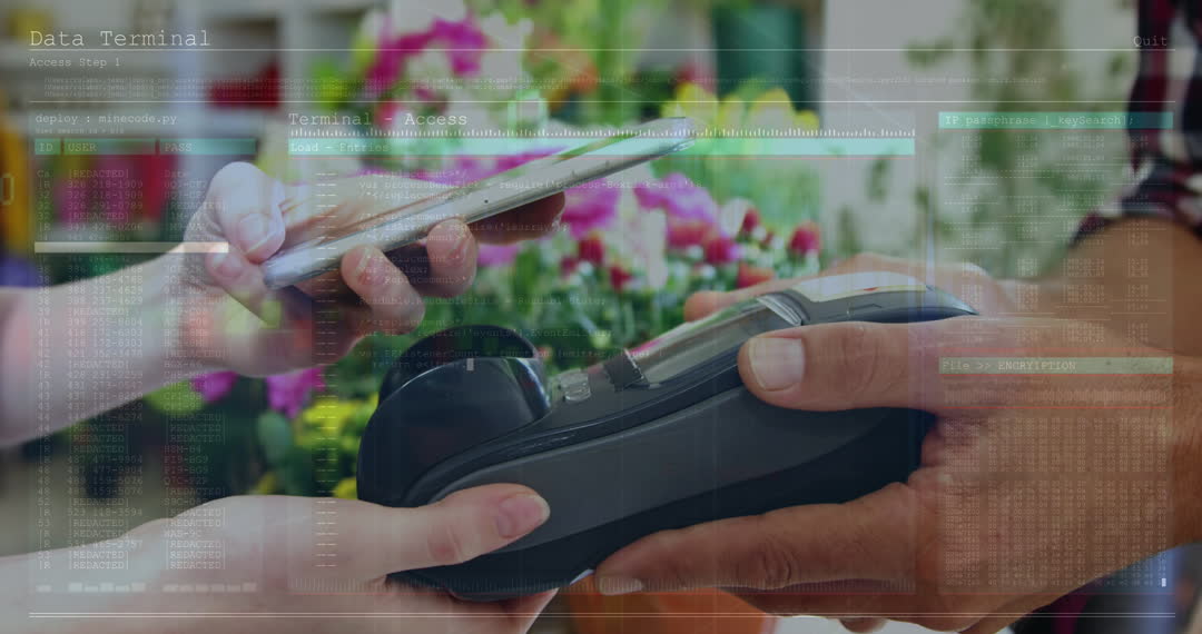 Overlay of financial data on an video depicting hands engaged in a mobile payment transaction next to vibrant flowers. Illustrates modern retail technologies focusing on seamless consumer experience with emphasis on digital and contactless payment methods. Useful for advertisements in financial services, technology blogs, or modern business solutions to highlight convenience and efficiency in payment processing.
