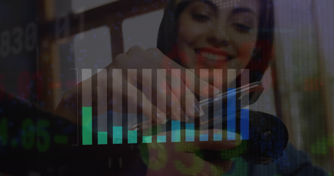 Dynamic visualization showcases a woman using a smartphone for a contactless payment amidst financial data and statistics. Useful for illustrating concepts in digital banking, technological advancements in finance, global business trends, and educational resources on modern financial transactions.