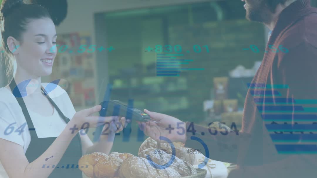 Contactless Payment at Bakery with Financial Analytics Overlay Video