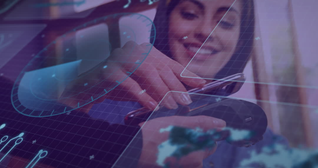 This video illustrates the seamless integration of digital technology with modern payments, highlighting a woman engaging in a contactless transaction. Overlaid graphs and charts suggest advanced financial analytics, appealing to businesses focused on innovations in finance, banking, or e-commerce. Ideal for use in technology blogs, financial service promos, or educational content about financial technology advancements.